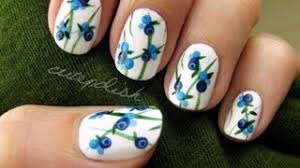 - Next, use a green striper to make three or four random lines to represent the vines on the blueberry. After you are done, use a dotting tool dipped into dark blue polish to create a few blueberries.